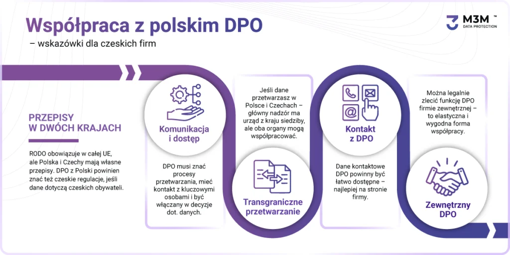 Czescy przedsiębiorcy mogą legalnie korzystać z usług polskiego Inspektora Ochrony Danych, ale powinni znać przepisy obowiązujące w obu krajach. Bardzo ważne jest zapewnienie DPO dostępu do informacji i dobrej komunikacji. W przypadku transgranicznego przetwarzania danych konieczna jest współpraca między organami nadzorczymi. Outsourcing DPO to wygodne i zgodne z prawem rozwiązanie wspierające zgodność z RODO.